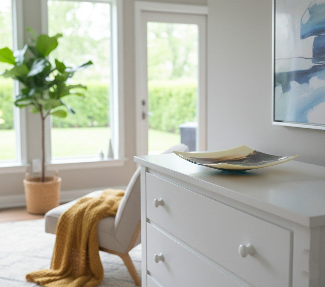 Hand-cast reactive glass, fused in a special low and slow process to preserve the delicate shifts in colour, then kiln-formed.