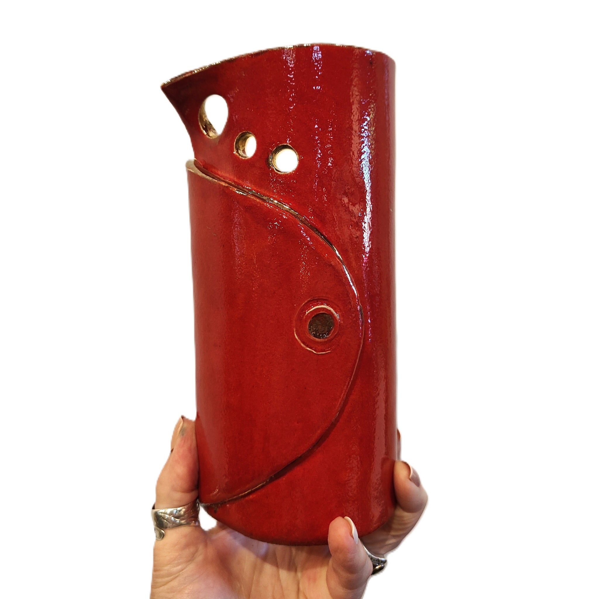 Hand built decorative pottery vase with 24K gold trim. Glass insert to hold water for flowers.