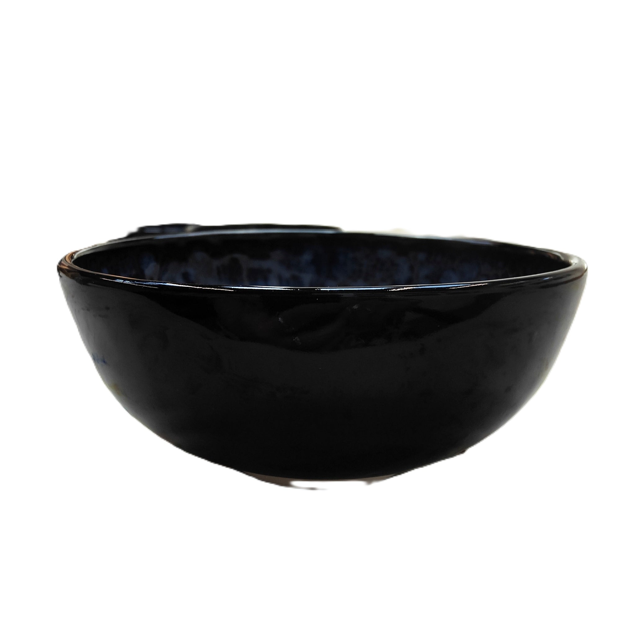 The exterior is finished in a smooth, glossy black glaze, providing a dramatic contrast that frames the richly textured interior. Thrown and glazed by hand, this piece celebrates the unpredictability of glaze chemistry — no two bowls are ever the same.