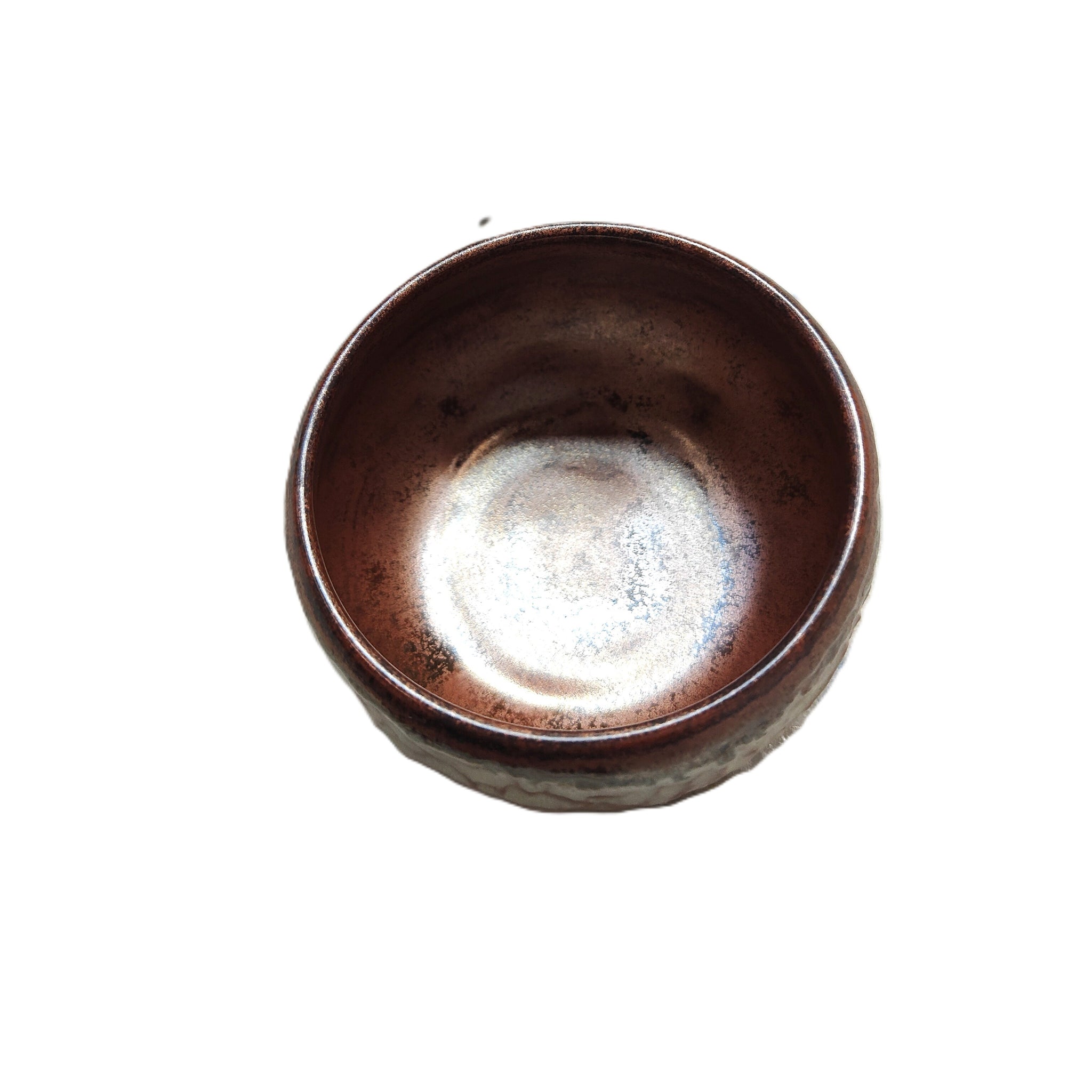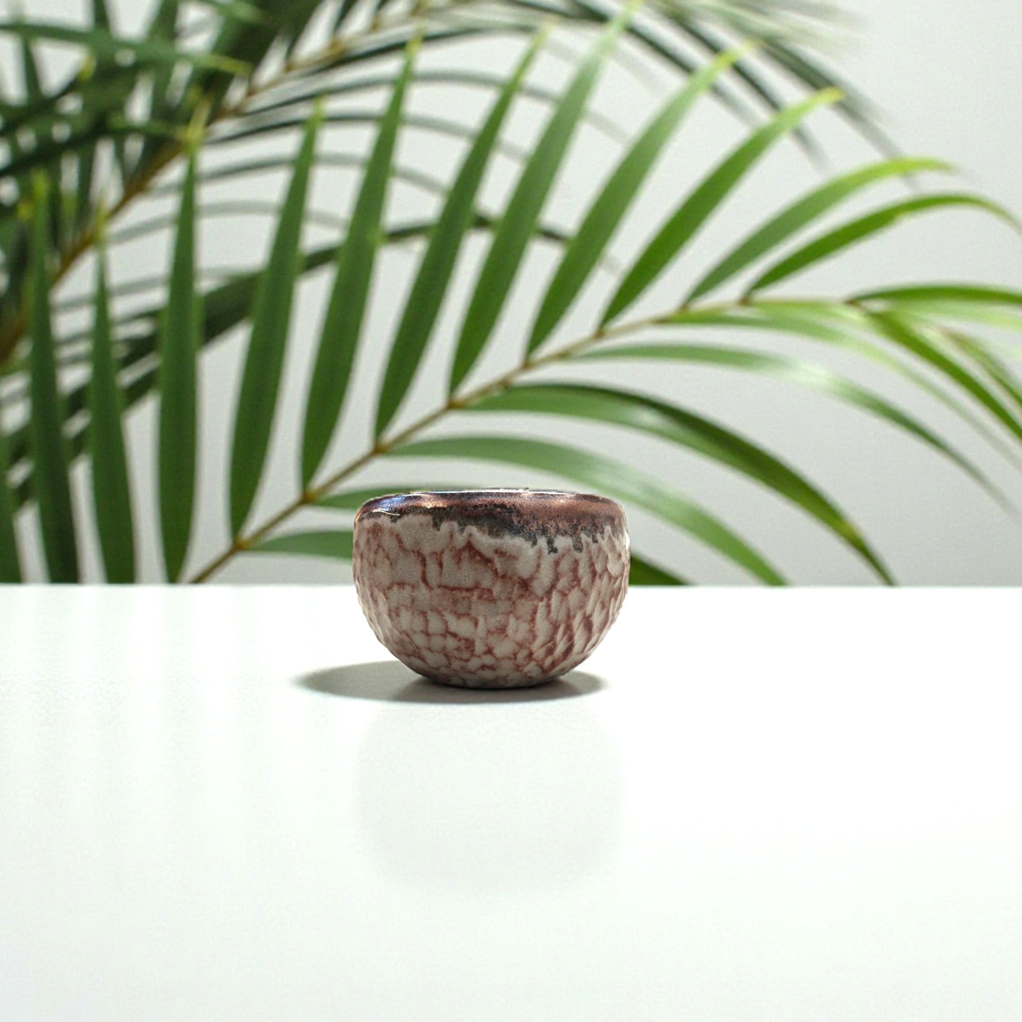 Handmade by ceramic artist Rachel Buxton, this small pottery bowl features a softly rounded form and a beautifully mottled glaze reminiscent of iron-rich stone and weathered earth. Warm rust tones break through a pale, chalky surface, while the darker rim adds depth and quiet contrast.