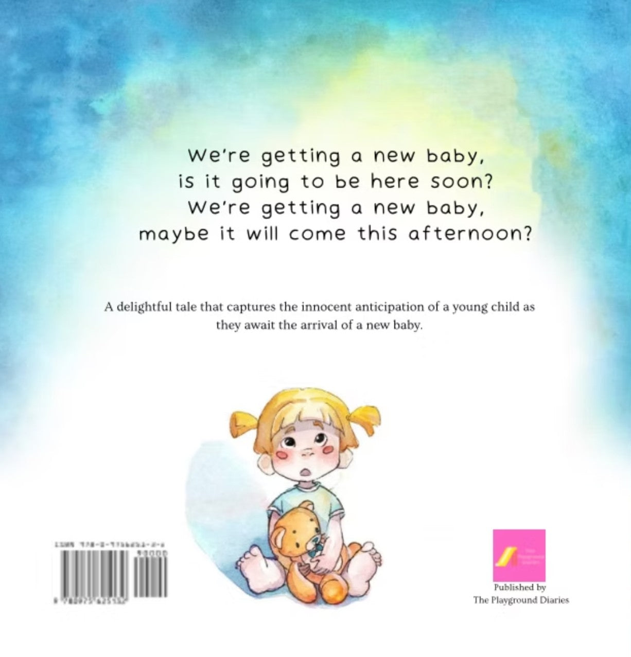 A delightful story that captures the innocent anticipation of a young child as they await the arrival of a new baby. As the story begins, the child is unsure how they feel about a new baby joining their family but their uncertainty soon turns to excitement as they start to imagine all the fun things they will be able to do together. Told through rhyme and repetition with beautiful watercolour illustrations, this book is sure to delight young readers as well as adults. 28 page children's picture book.